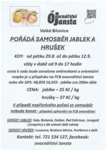Ovocnářství Jansta Velké Bílovice – SAMOSBĚR JABLEK A HRUŠEK od 29.8. do 12.9. v době od 9h do 17h každý den v týdnu Datum: 27.08.2025 Datum sejmutí: 15.9. 2025