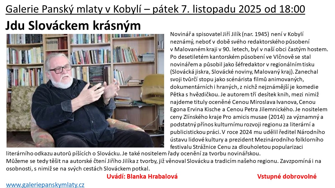 Spolek Panský mlaty v Kobylí zve na večer s Jiřím Jilíkem, v současnosti nejvýznamnějším regionálním spisovatelem na Slovácku. Jeho autorské čtení se uskuteční v galerii Panský mlaty v Kobylí tento pátek 7. listopadu, začátek v 18 hodin. Vstupné dobrovolné, občerstvení zajištěno.