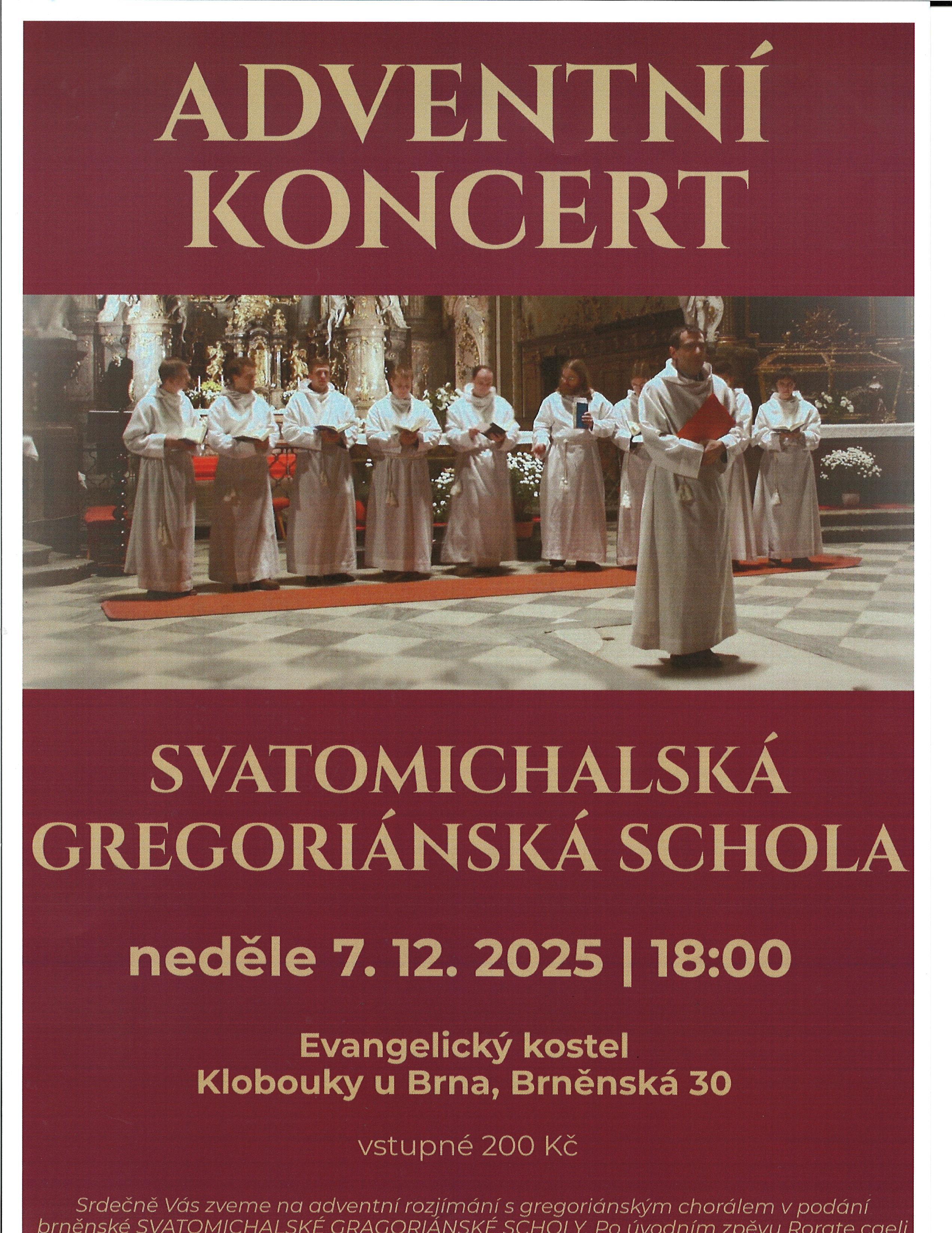 Adventní koncert – Svatomichalská gregoriánská schola – 7.12.2025 od 18h v Evangelickém kostele Klobouky u Brna Datum: 02.12.2025 Datum sejmutí: 8.12. 2025