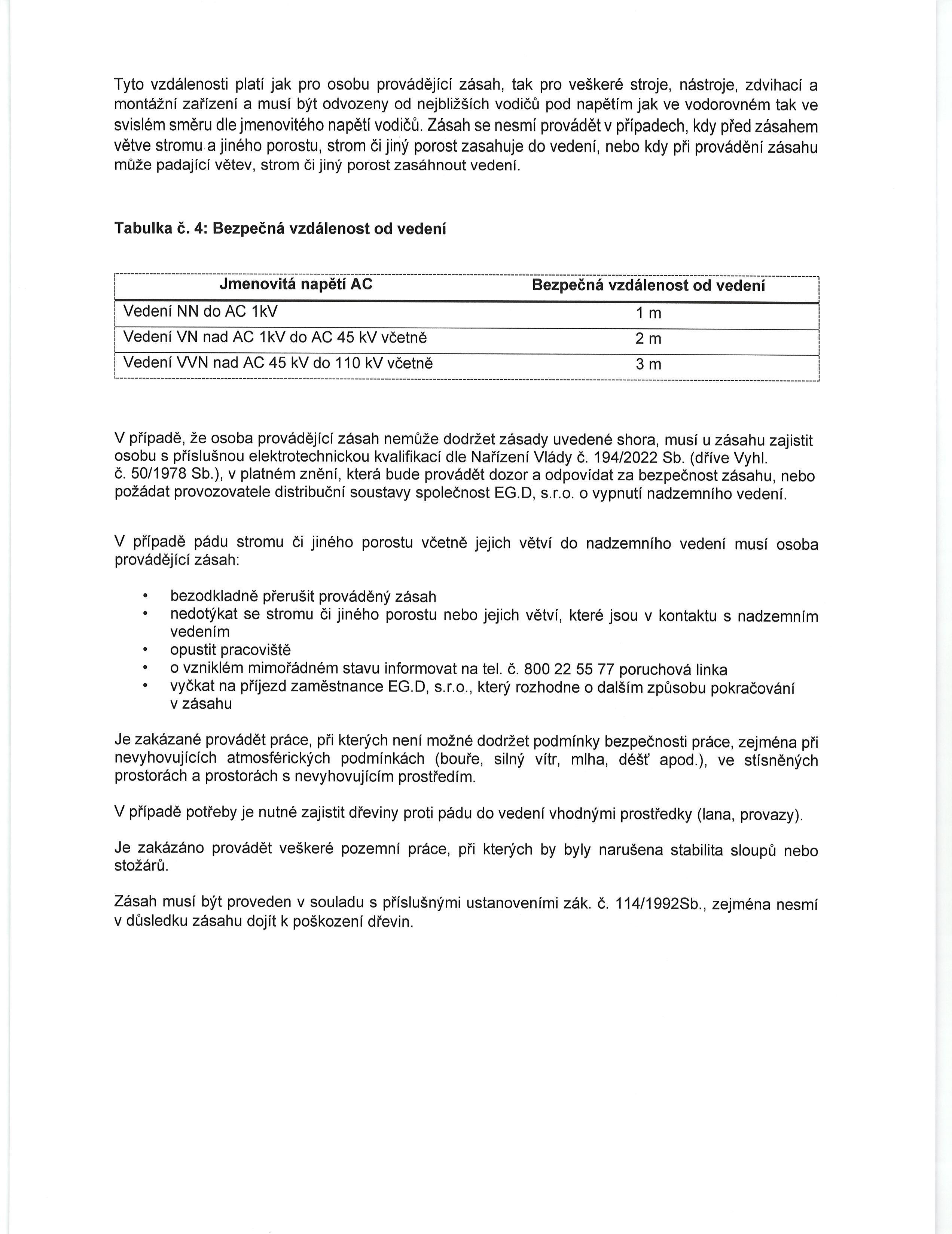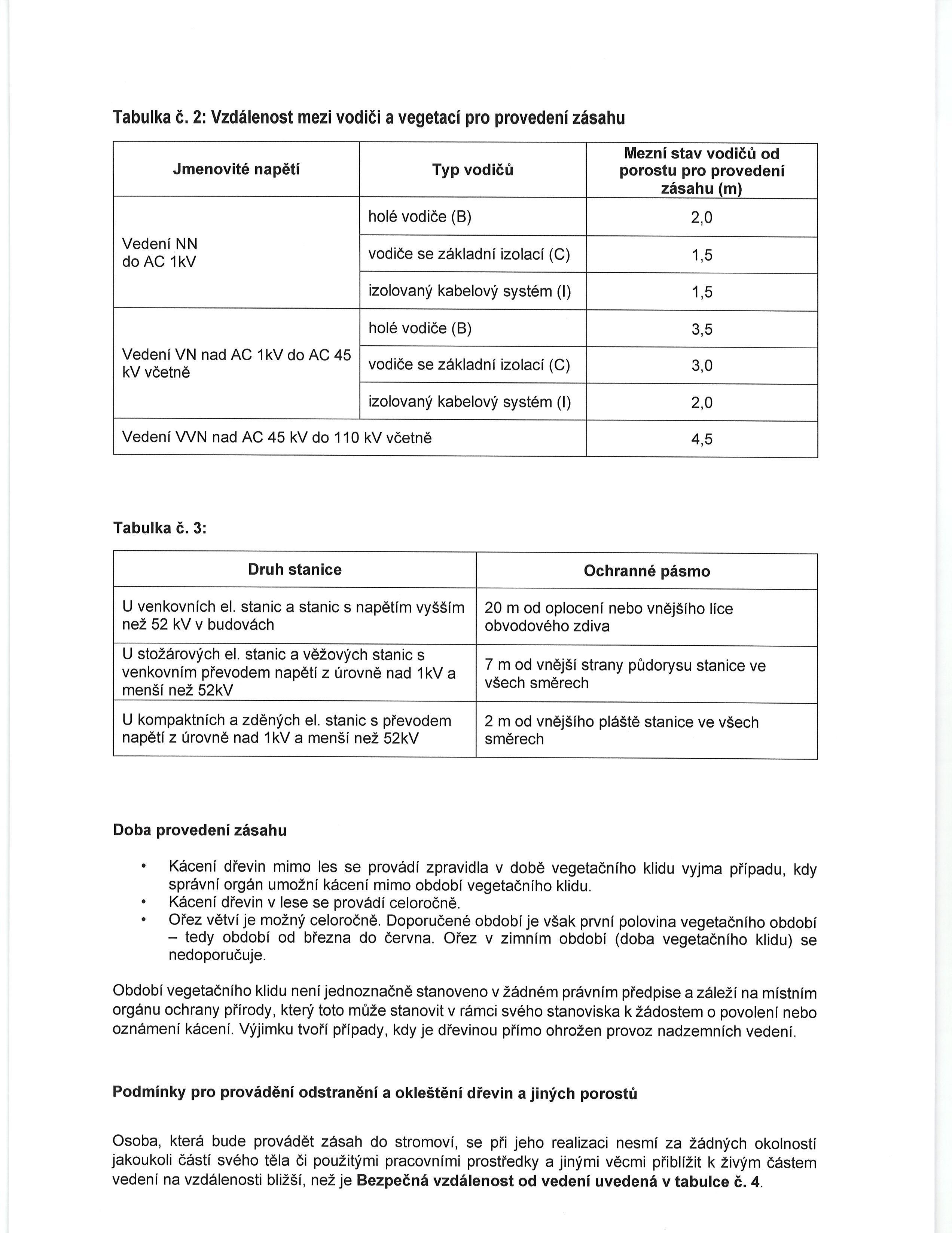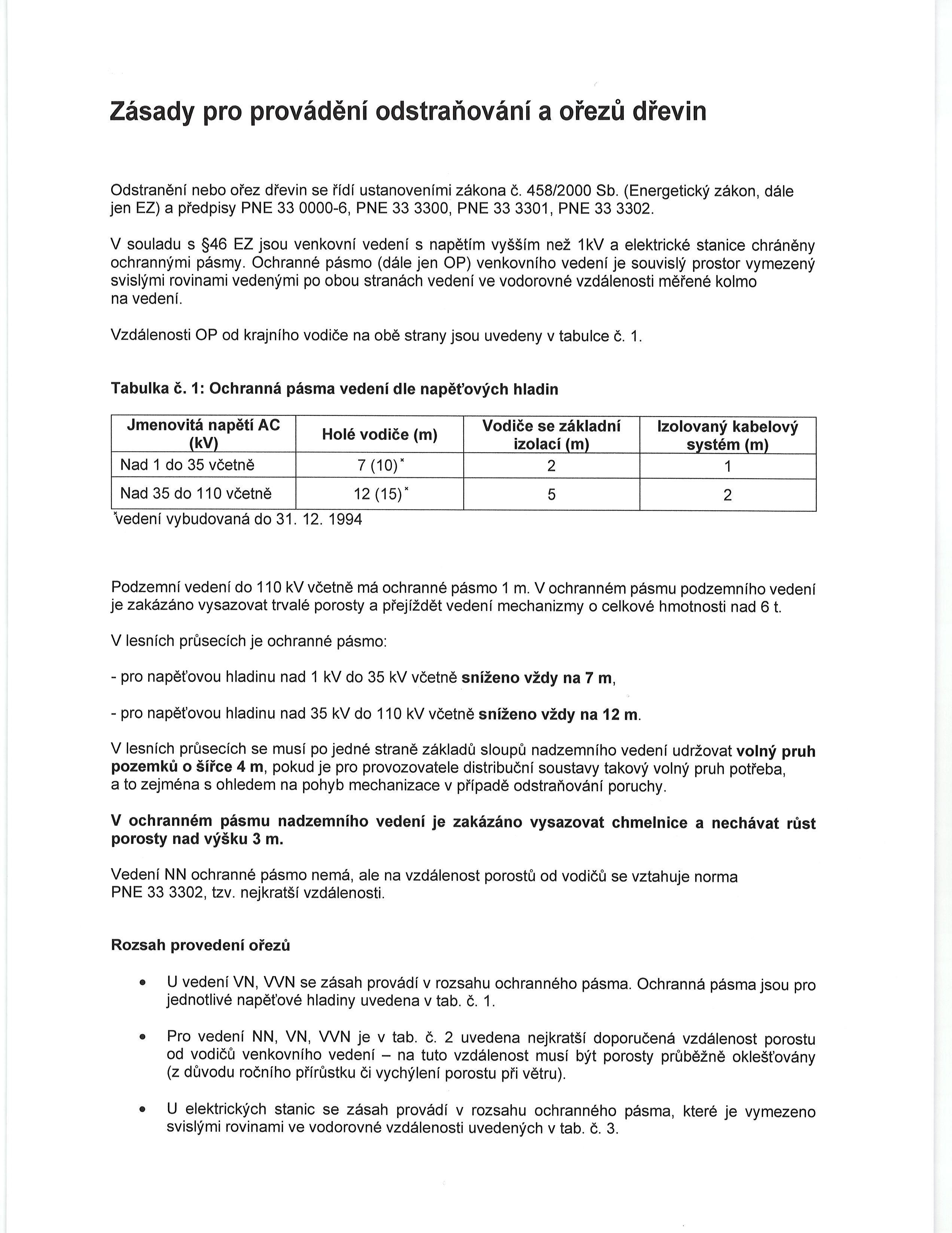 Vlastníci a uživatelé pozemků jsou ze zákona povinni udržovat vegetaci (dřeviny, stromoví a jiné porosty) v bezpečné vzdálenosti od venkovních elektrických vedení a zařízení. Tato povinnost vyplývá z Energetického zákona č. 458/2000 Sb., ve znění pozdějších předpisů. Upřesňující informace jsou uvedeny na plakátu Upozornění vlastníkům či uživatelům nemovitostí (pozemků) a v dokumentu Zásady pro provádění odstraňování a ořezů dřevin